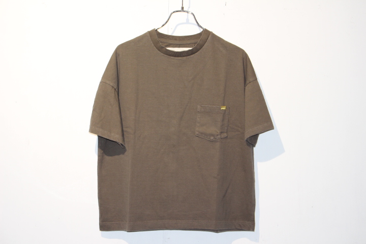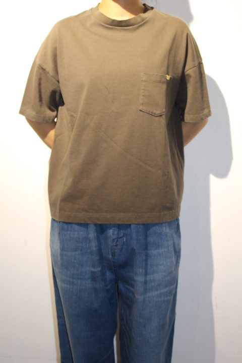 ボックスTシャツは、色あせたような加工感のあるオリーブの色味が大人のスタイリングに馴染みます。