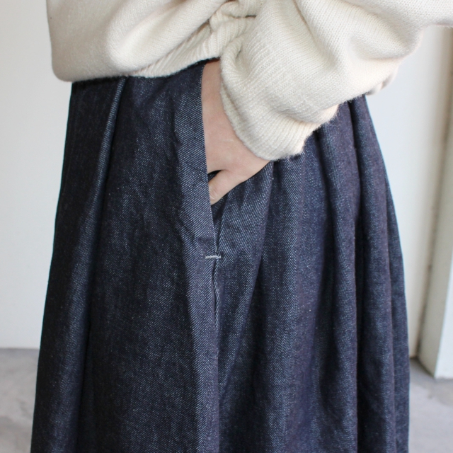 基本のデザインは同じで、生地に10オンスのデニムを使用したデニムカルメンキュロット。