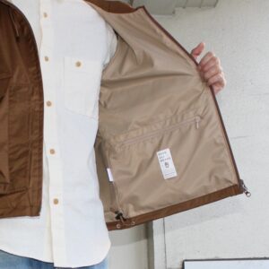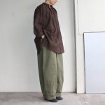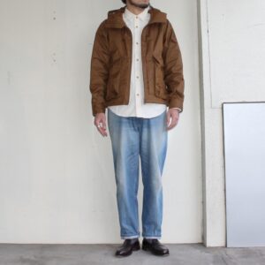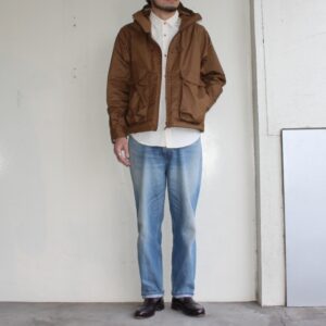 ワーク感の強いブラウンですが、生成り色のシャツを合わせるだけで印象はとても落ち着きます。