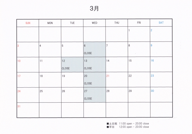 6日(wed)、12日(tue)、13日(wed)、20日(wed)、27日(wed)が店休日となります
