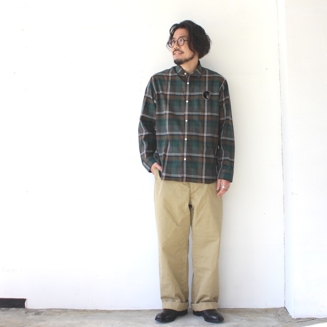 ■ TAIGAKUN コットンフランネルチェックシャツ 【BRAND】 weac. / ウィーク 【COLOR】 Green check weac.のシャツ「TAIGAKUN」 あの名作PUGCHANがいったんお休みということで、代わりにタイガ君が登場してくれました。 相良刺繍という伝統的な技法で丁寧に作ったタイガクン刺繍のワッペンを左胸に。 手間のかかる技法ですが、一般的な刺繍よりも丈夫で、作品としても非常に趣のある仕上がりです。 もちろん縫製の仕様など細かい部分も非常に丁寧に仕上げています。 シルエットなどの基…