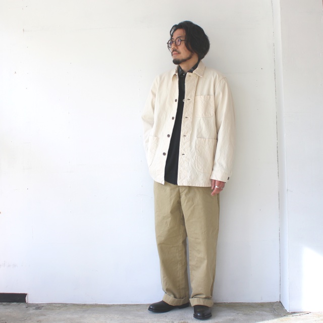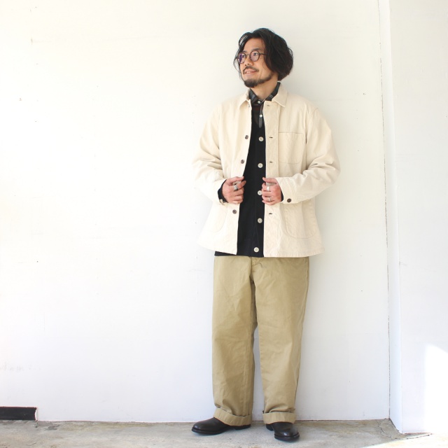 ■10OZ Canvas Coverall 【BRAND】 SEUVAS / ソウバス 【COLOR】 Natural SEUVASより「10OZ Canvas Coverall」 倉敷帆布製の10オンスキャンバスを使用したカバーオール。 キャンバスの風合いと縫製の美しさを堪能できる国産ならではのデザインが魅力のカバーオールです。 ハンドメイドで生産されるBotao (ボタオ)の天草ボタンがアクセントとなっています。 第一ボタンのみ使用したさりげない主張がポイント。 シルエットはカバーオールらしくゆったりしています。 着込んでいく経年変化と…