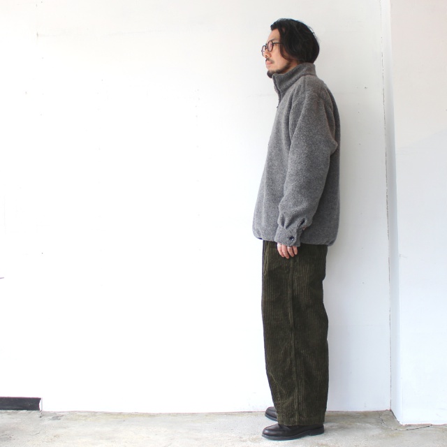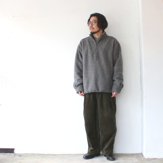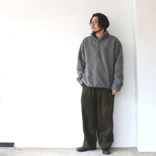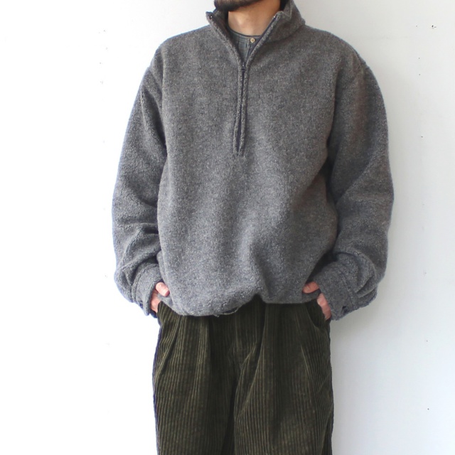 ■ ウールパイルハーフZIPプルオーバー Wool Pile Zip Stand 【BRAND】 melple / メイプル 【COLOR】 Gray melpleより「Wool Pile Zip Stand」 日本に3台しかない希少な丸編み機を使い、ゆっくりと空気を含んだようにふっくらとしたウールパイルの着心地は秀逸。 太番手のウール糸を使いバルキーでリッチな印象も最高。 フロントはハーフZIPタイプで、スタンドネック、襟を開くのもOK。 インナーのボリューム感や、その時の気温によって使い分けるのも良いと思います。 メインと…