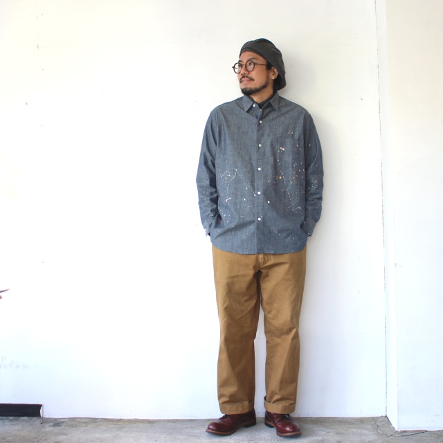 ■ ペイントシャンブレーワークシャツ Logan Chambray Shirt 【BRAND】 melple / メイプル 【COLOR】 Blue melpleより「Logan Chambray Shirt」 70‘s Arrow社製シャツをベースにした1着は、フレンチフロントの前立てや両裾マチなどクラシカルな印象に仕上がっている。 生地はオーセンティックな雰囲気の漂う4.5ozシャンブレー。 米・ストアブランドが当時展開していたシャンブレー規格を再現して備後地区で織り上げたインディゴのシャンブレー生地です。 少しムラが強めの糸を使用す…