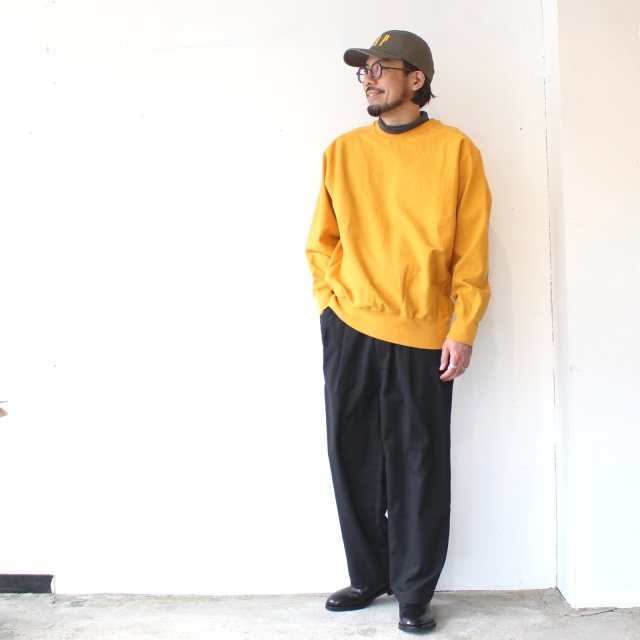 ■ コットンウールヘビースウェットクルー Cotton wool fleece machine reverse sweat 【BRAND】 siora / シオラ 【COLOR】 Yellow ocher sioraより「Cotton wool fleece machine reverse sweat」 丸編み裏毛機を使用して度詰めに編み上げたスウェットクルー。 糸は表糸に綿100%、裏糸に綿80%/ウール20%の糸を使い、適度な保温性と肉厚感のある生地に仕上がっています。 洗っても形状の変わりにくい目の詰まった生地は、数年着こんでも健在でいてくれます。 肩と脇部分のリ…