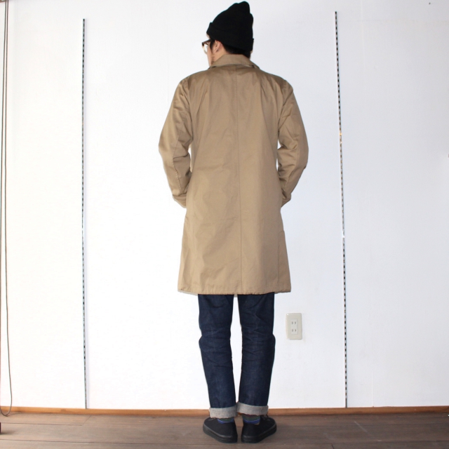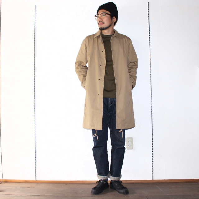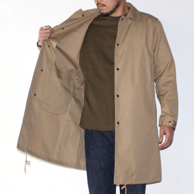 一見普通のステンカラーコートのようですが、裾にドローコードを配してコーチジャケットの要素も。