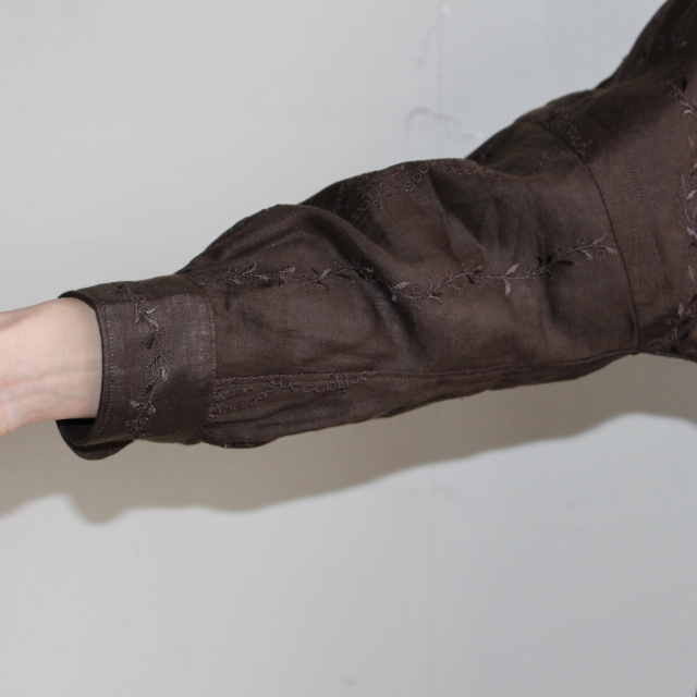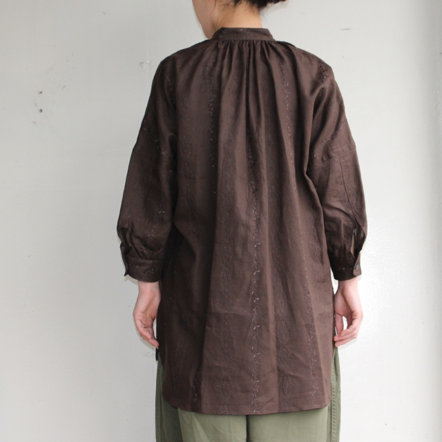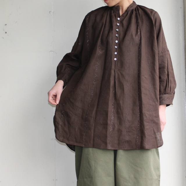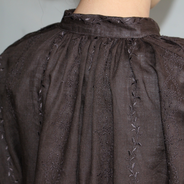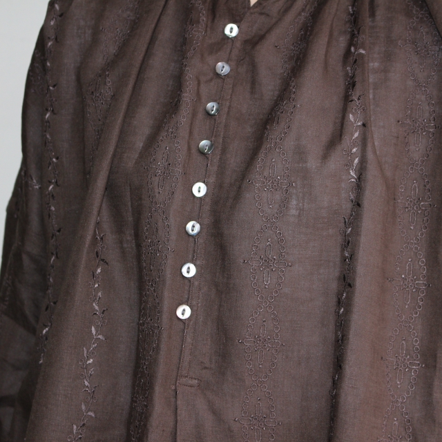 首周りにはギャザーを入れ、ボタンは猫目シェルボタンなど細かい部分もしっかり作られています。