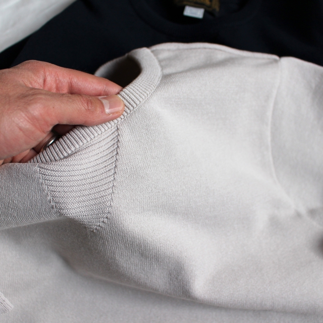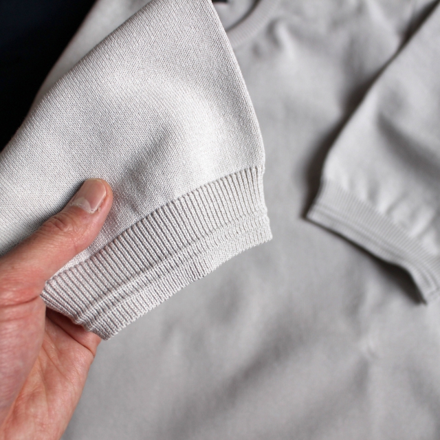 中空糸とコットン糸を撚り合わせた糸から編み上げられたニットは、軽くふっくらした着心地の良い仕上がりです。
