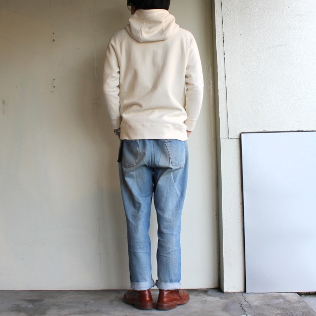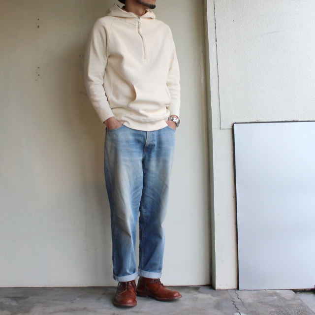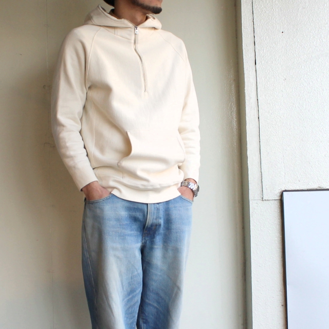 首元のハーフZIP、9分丈の袖が特徴的で、しっかりしたスウェット生地を、東京の信頼あるファクトリーにて縫製した丁寧な仕上がりです。