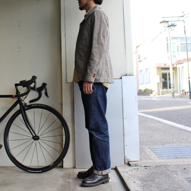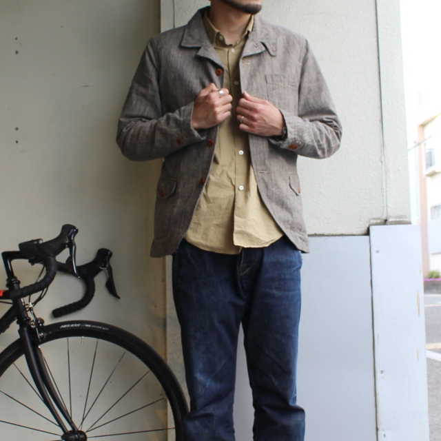 今季のモデルは、通年定番のサックジャケット(OR-4012)よりも、明るい色調で柔らかいストライプの織柄があるコットン生地を使用。