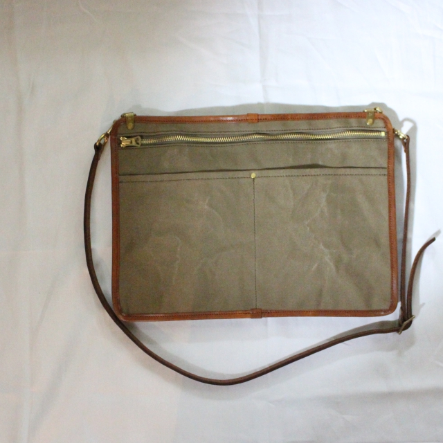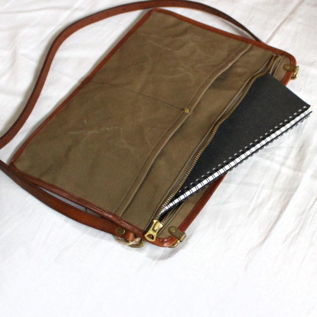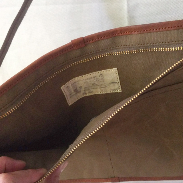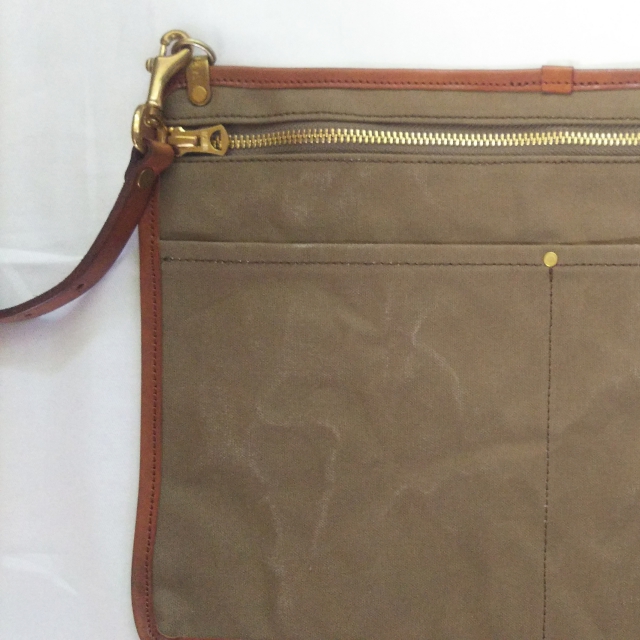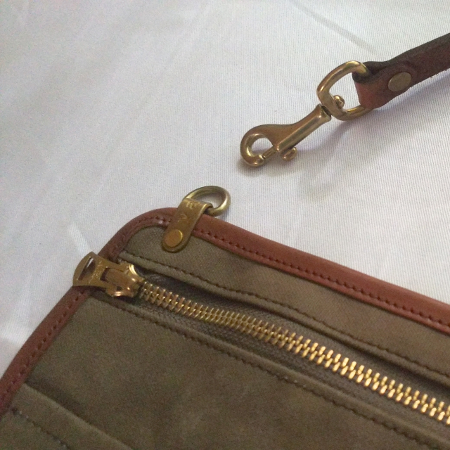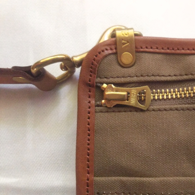 ジップはUNIVERSAL、ストラップ取り付け部の真鍮パーツにはvasco刻印のオリジナルプレートを使用した贅沢なつくり。