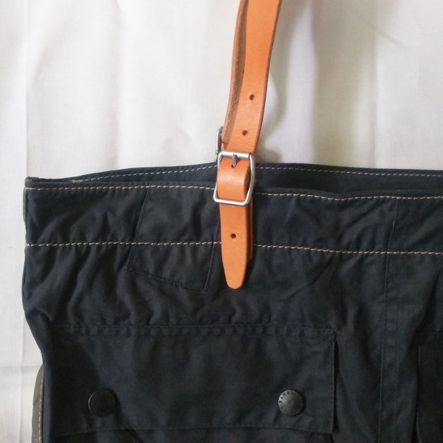 ハンドル部分は新品のレザーベルトでサイズ調整可能、バッグ底はミリタリーテント生地を使用しているので強度も安心。