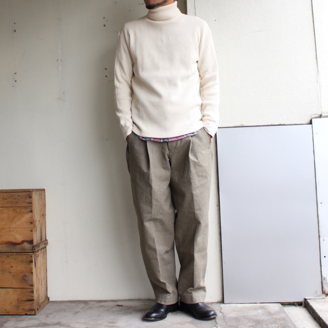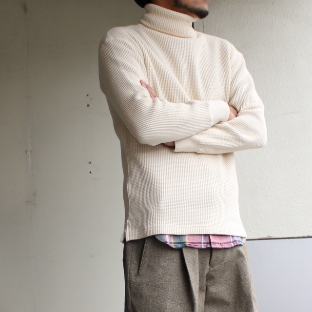 20番の太番糸で編み立てたコットンへビーワッフル生地にアレンジしたタートルネックカットソー。