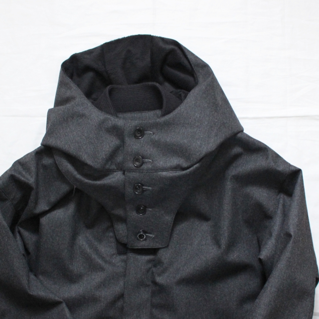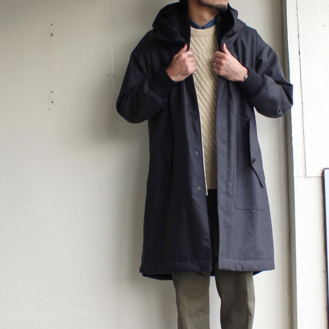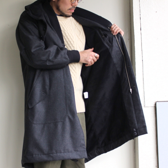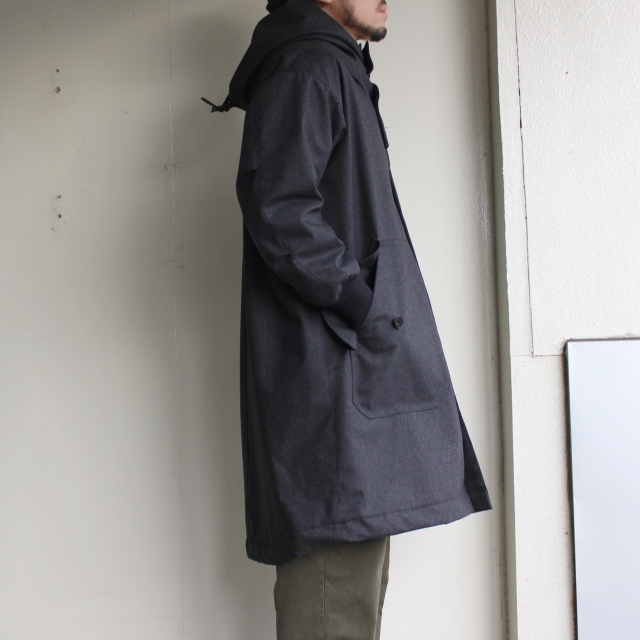 フード付きのモッズ風ロングコートですが、取り外し可能なフードと首元のリブがポイントで
