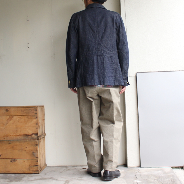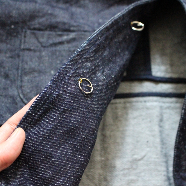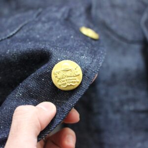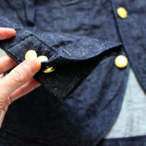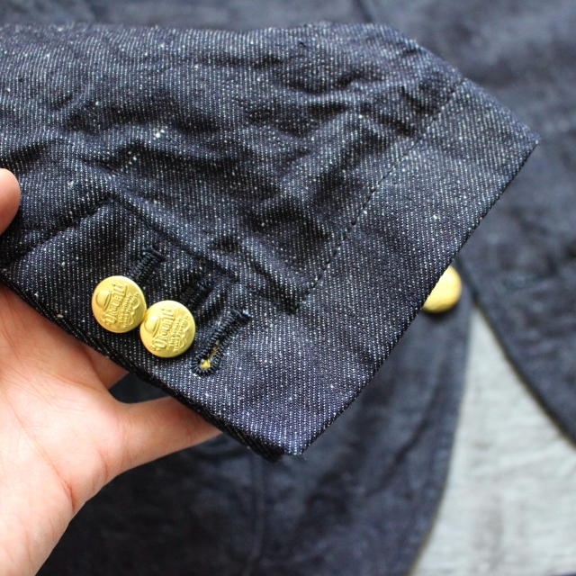 オリジナル刻印の真鍮ボタン、袖の本切羽仕様、生地裏のパイピング処理など随所に丁寧な仕上がりもみられるジャケットです。