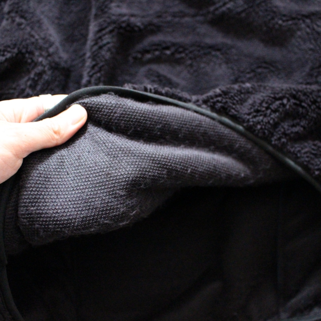 フラップポケット、フードの淵、ポケット中にもナイロン生地を配し、本体裏地はメッシュになっています。
