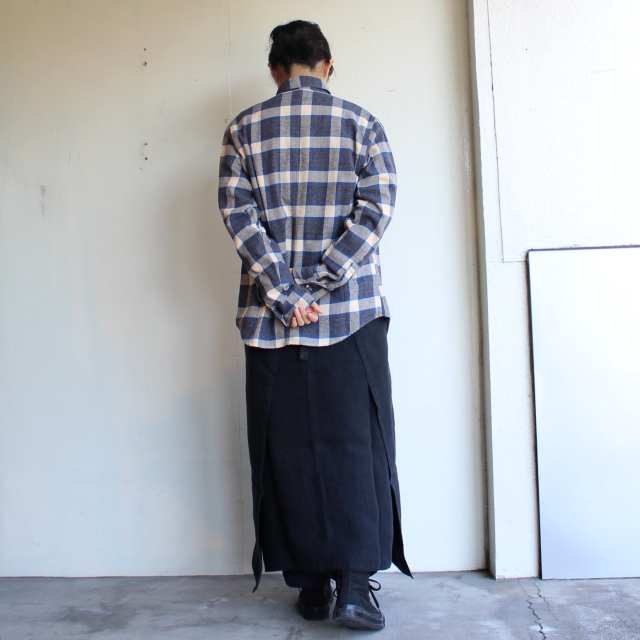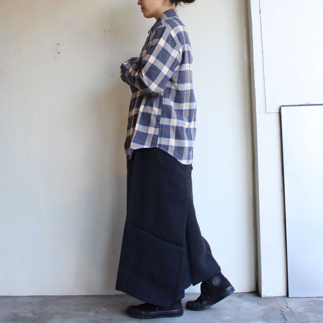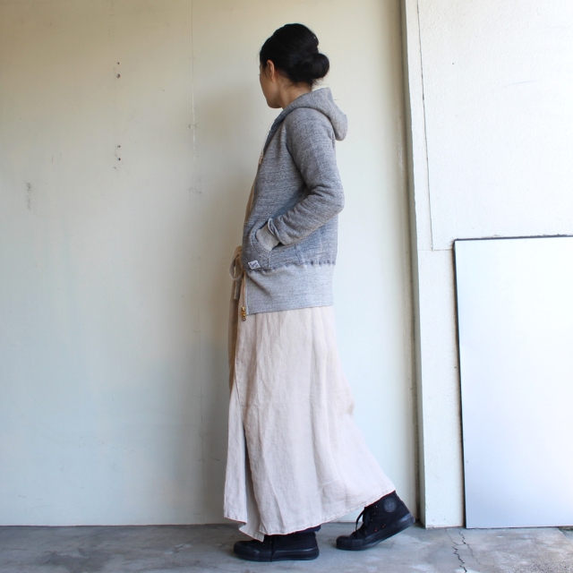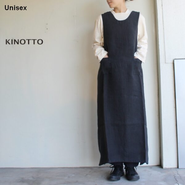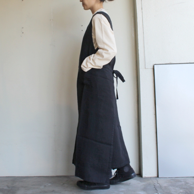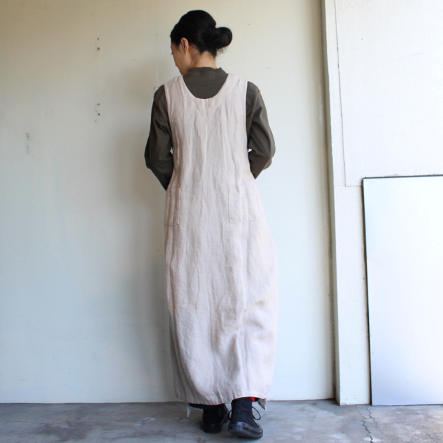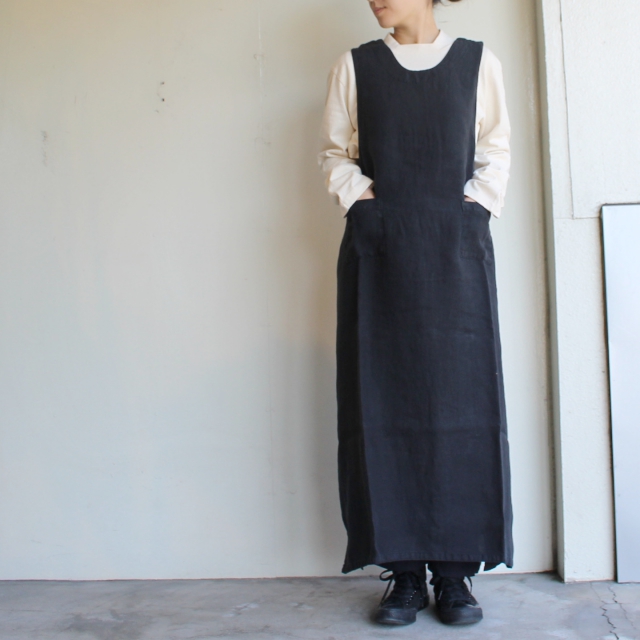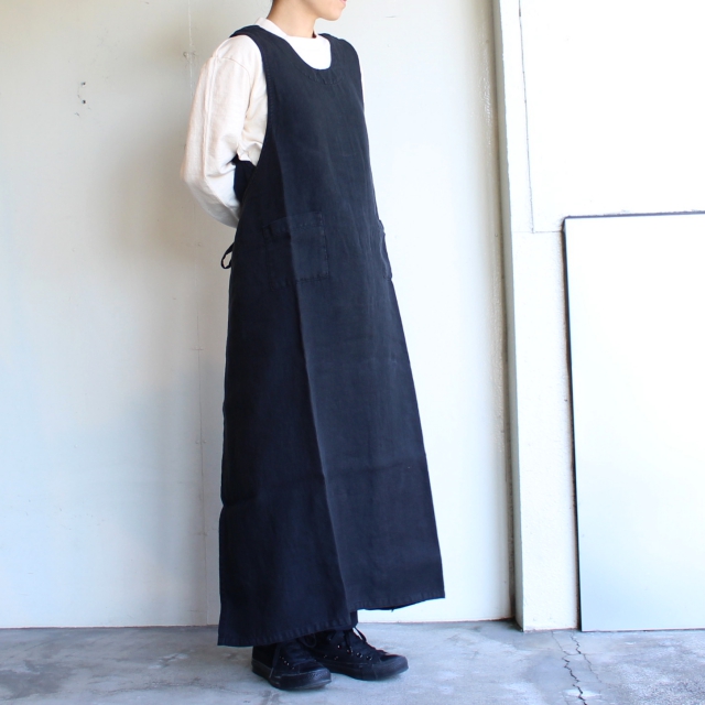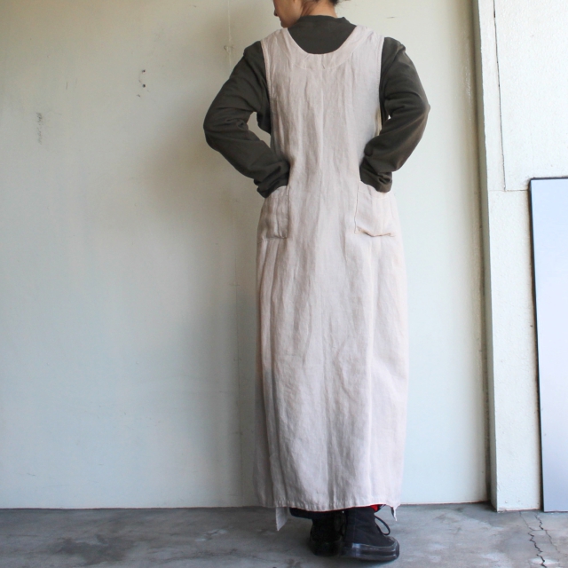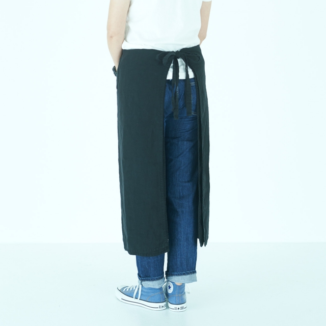 紐を前で結べばワンピースとしてのアクセントに、後ろで結べばエプロンとしてワークウェアになります。
