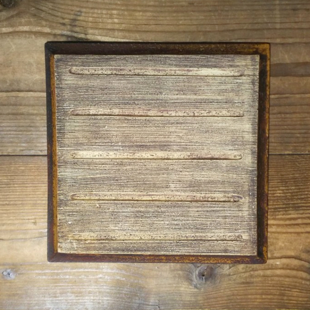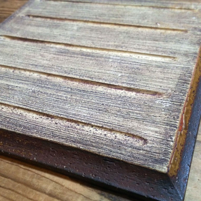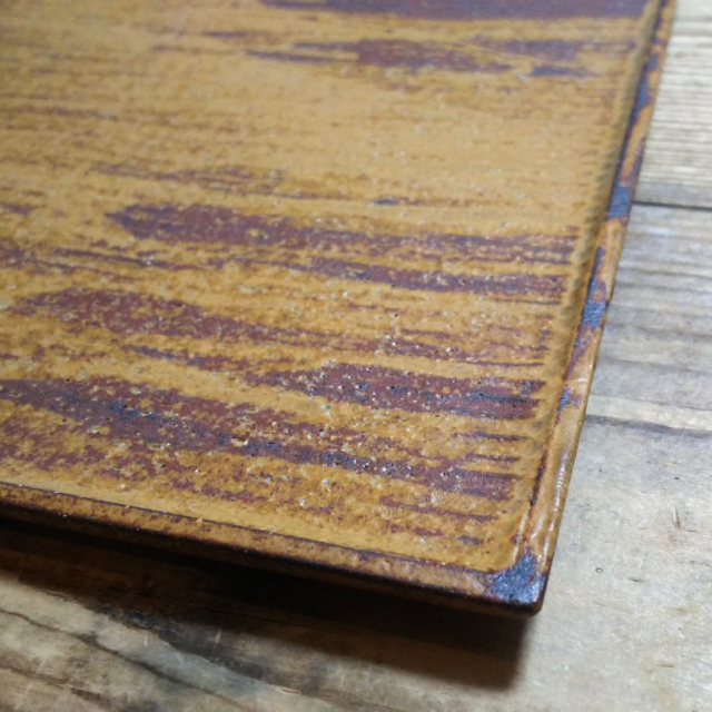 釉薬による暖かみのある色み、彫刻のようなどこか無骨な表情が特徴のスクエアプレート。