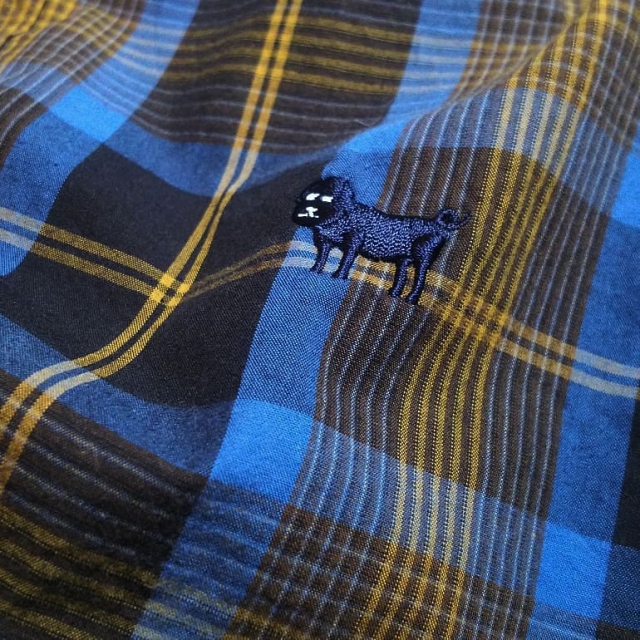 本貝ボタン、センターバック切り替え、そして胸には丁寧なパグの刺繍。