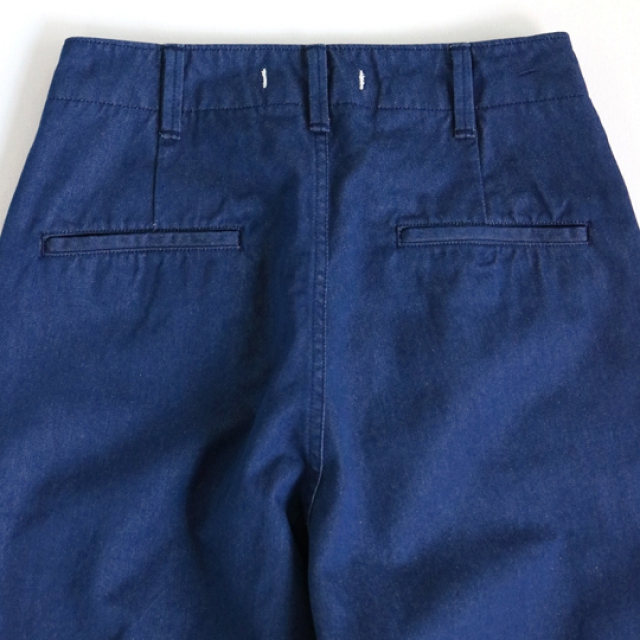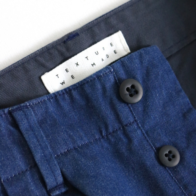 アメリカ綿を使用し、米軍の士官服のウェポンを意識した生地は光沢感があり、インディゴにはあまりない上品さが表現されています。