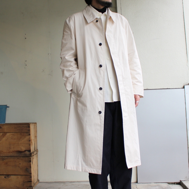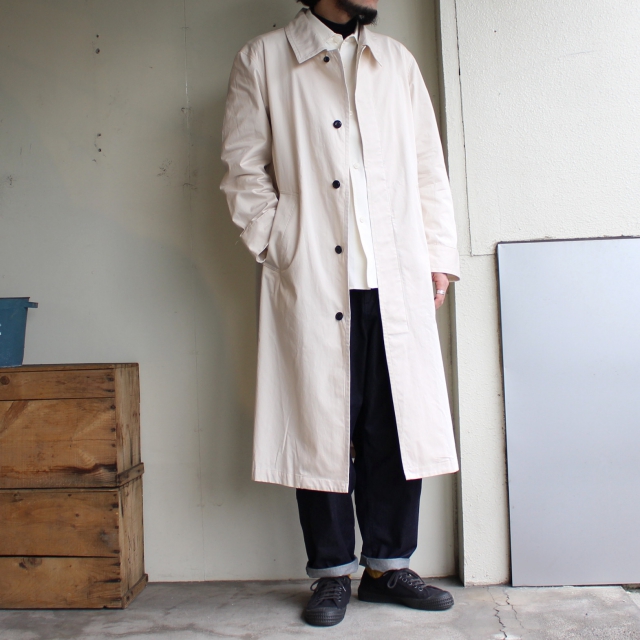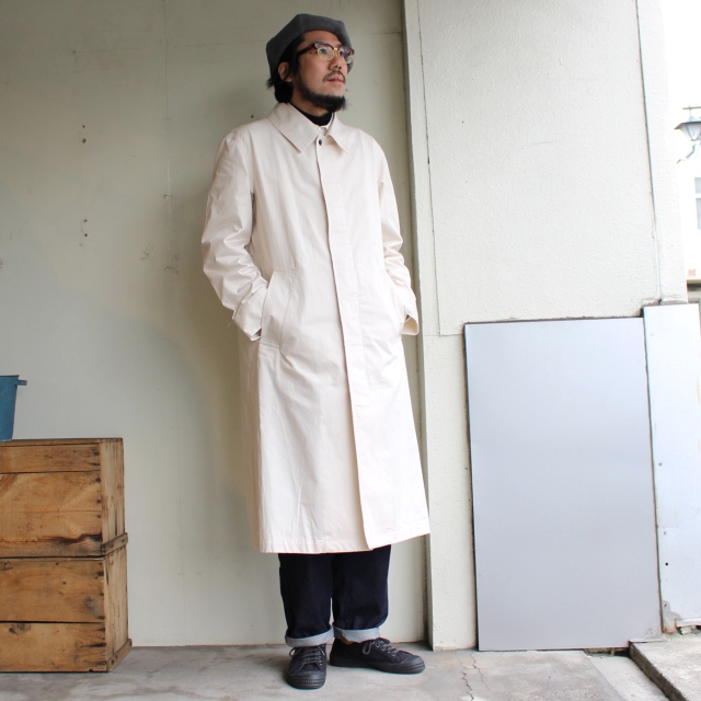 シルエットはややゆったりのバルマカーンコート(ステンカラーコート)。