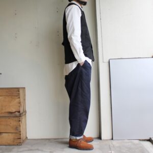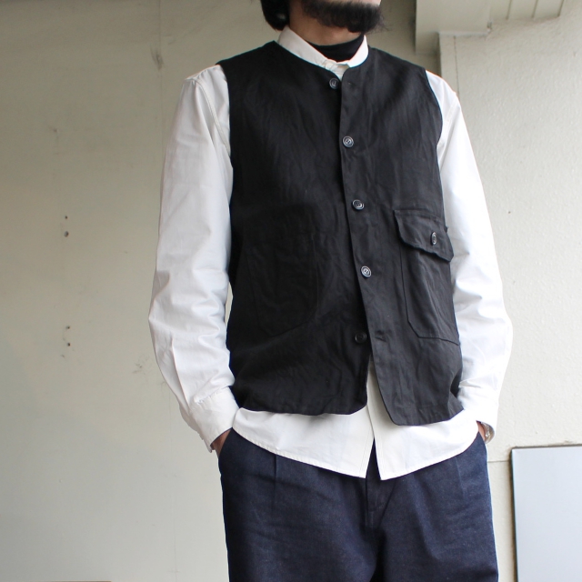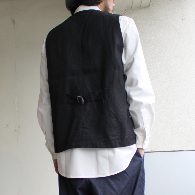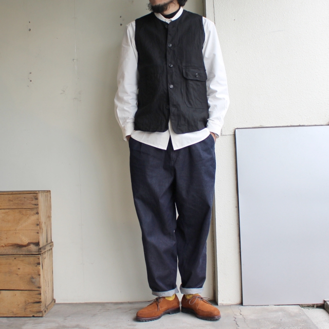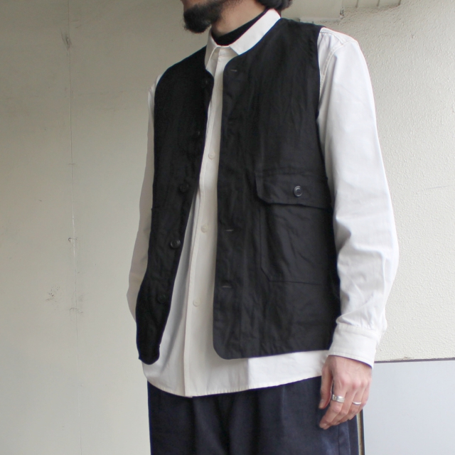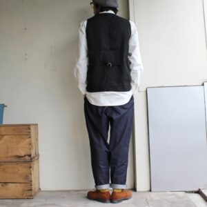 ヴィンテージのハンティングベストをデザインソースに再構築したweac.のベスト。