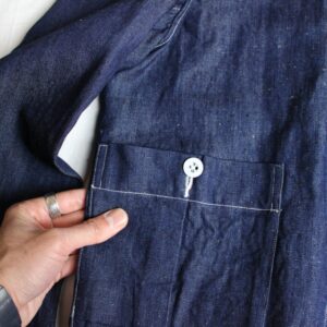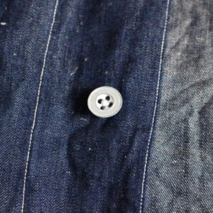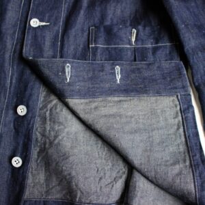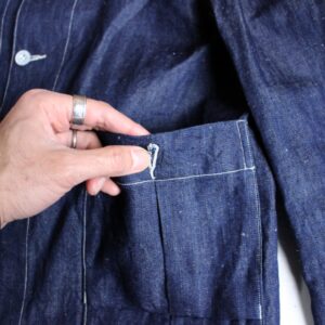 ヴィンテージライクなアルミボタンも使用し、クラシカルな折伏せのシングルステッチで仕上げることで