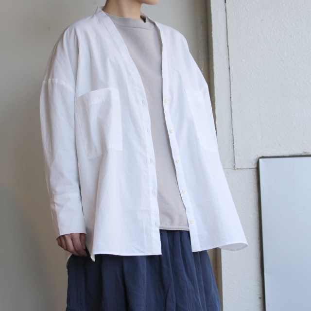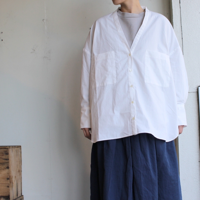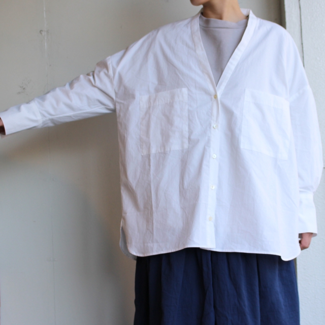 深めのVネックにボタン仕様のカーディガンのように着れるシャツ。