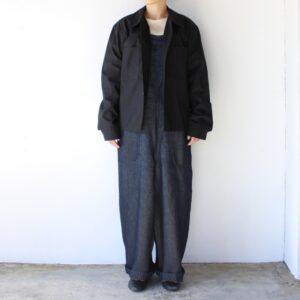 ワークテイストをベースに、後ろウェストはタック入り、胸にパッチポケットでデザインアクセントを。