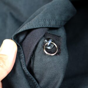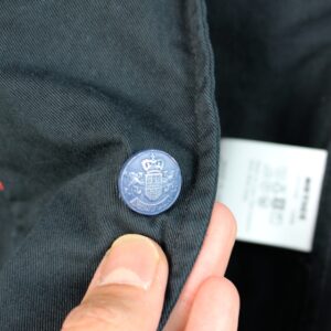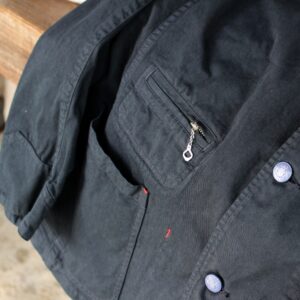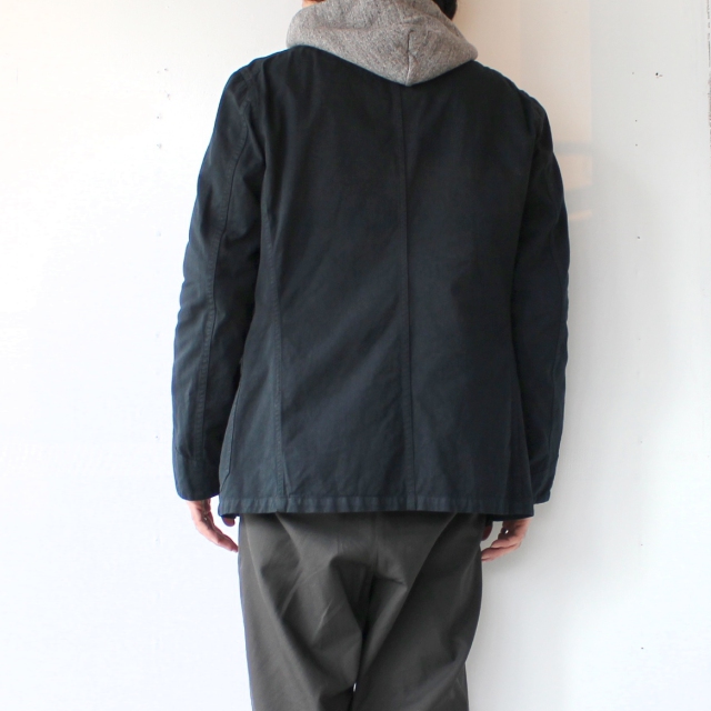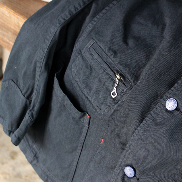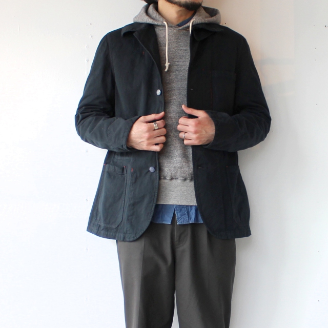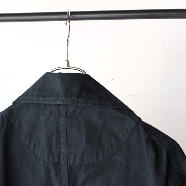 生地はドライな質感が無骨な印象のコットンドリルを使用し、製品染め後、樹脂加工を施し少し硬く仕上げています。
