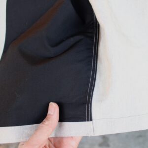 これを解決するため水撚りといわれる、糸を湿らして強撚にすることで、昔のフレンチワークウェアに見られたハイカウントリネンを再現。