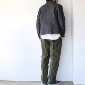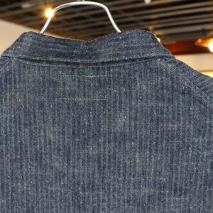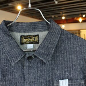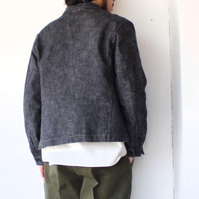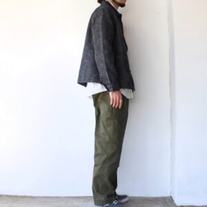 ヴィンテージの生地を再現するべく、オリジナルで生地開発から携わったオルゲイユらしい1着。コットン100%のヘリンボーンですが、当時のリネン生地の凸凹感を表現するため、ムラ糸を使用して製作しています。