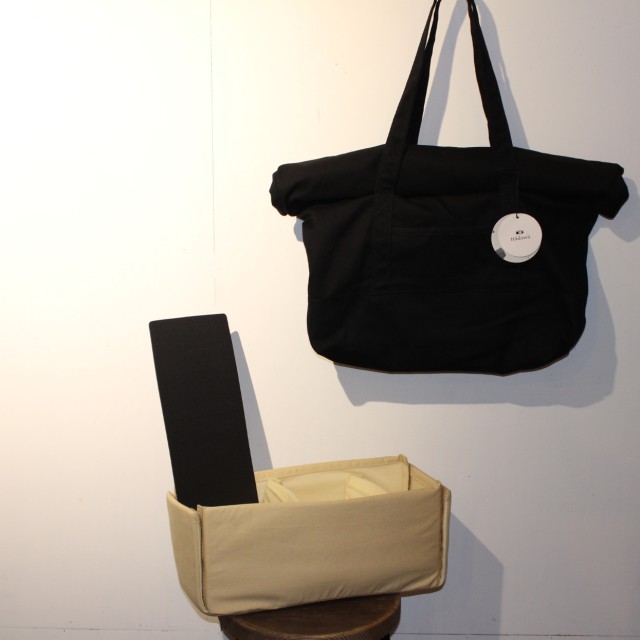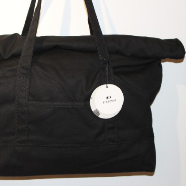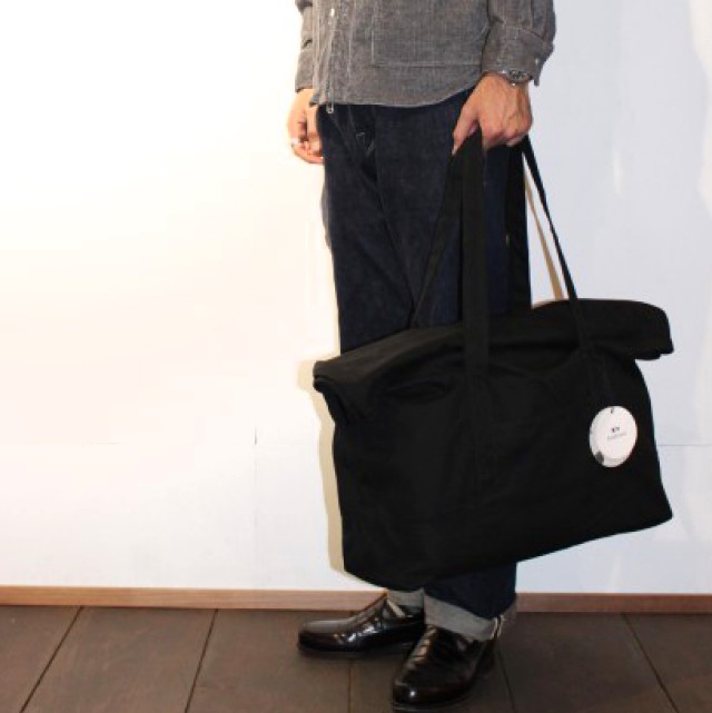 A3がちょうど入るサイズのこのバッグは、口をくるくると折り込んでフタをします。