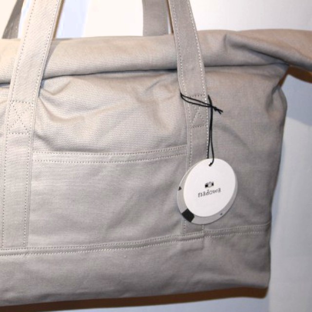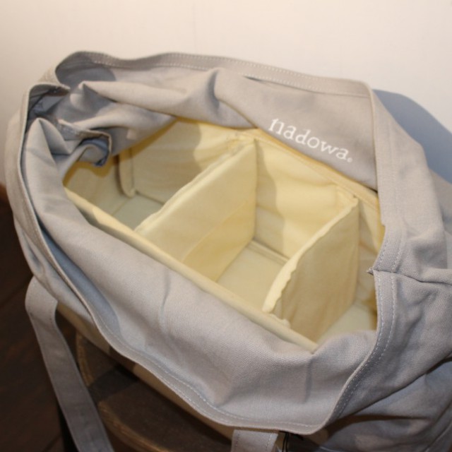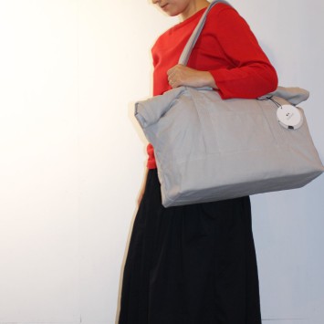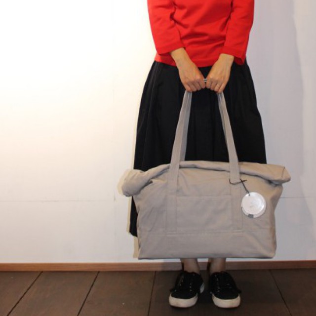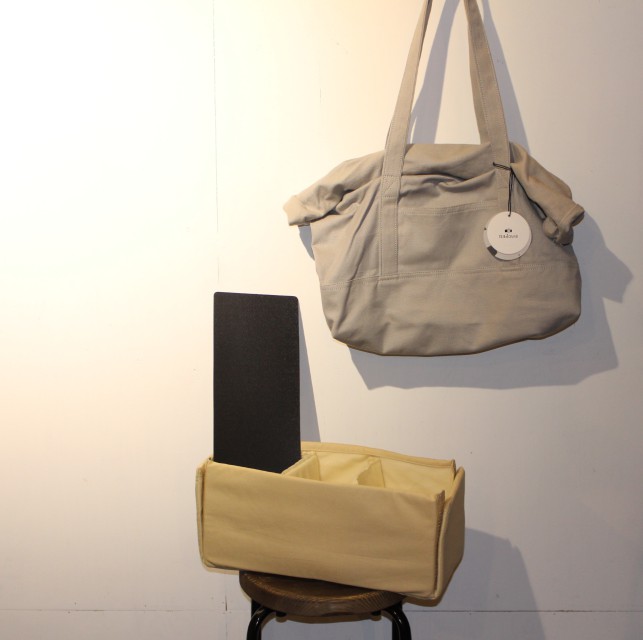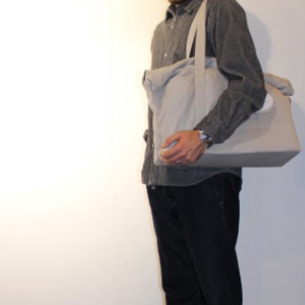 A3がちょうど入るサイズのこのバッグは、口をくるくると折り込んでフタをします。