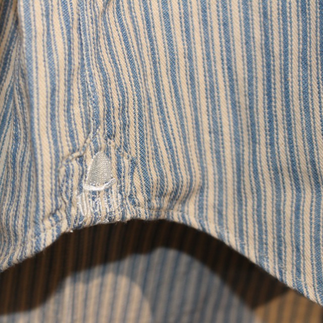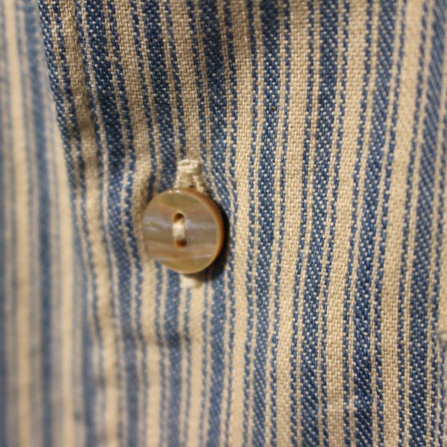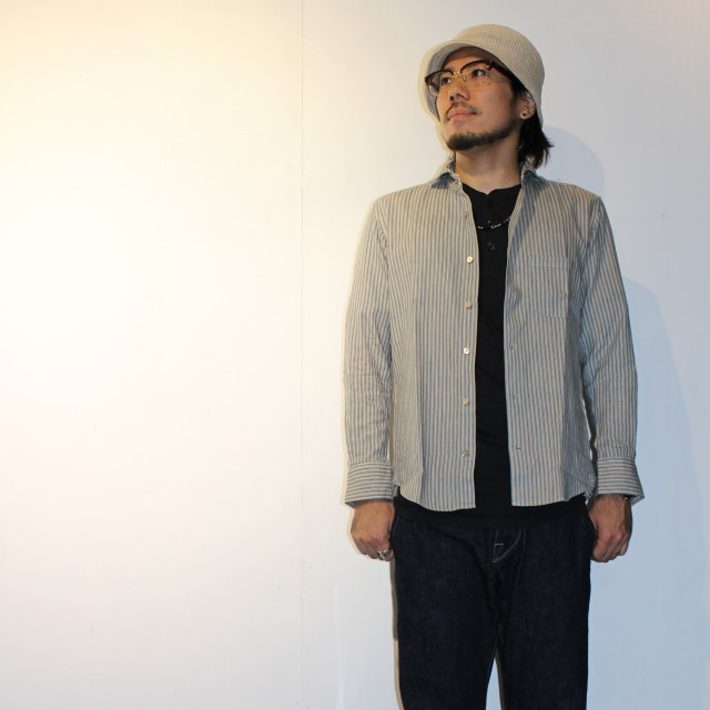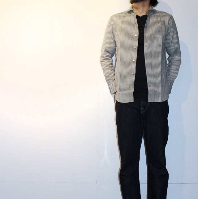 旧力織機で時間をかけて丁寧に織り上げたインディゴストライプ生地は、柔らかな着心地とヴィンテージ古着のような日焼けしたような雰囲気が特徴です。