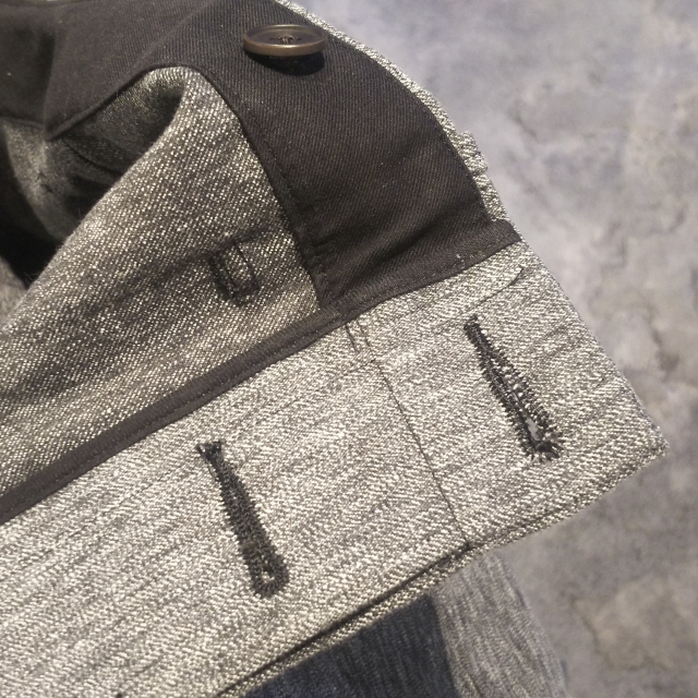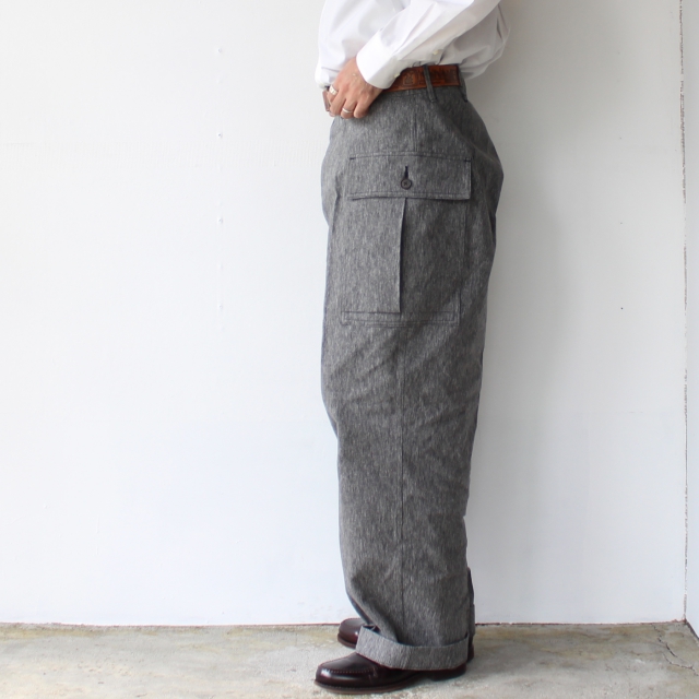 高めの位置の両サイドカーゴポケット、ボタンフライ、パイピング仕上げ、ベルトループは細めの仕様。