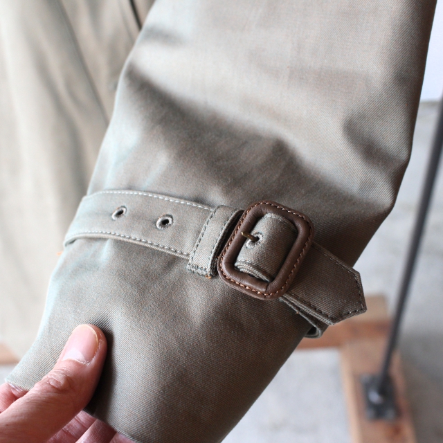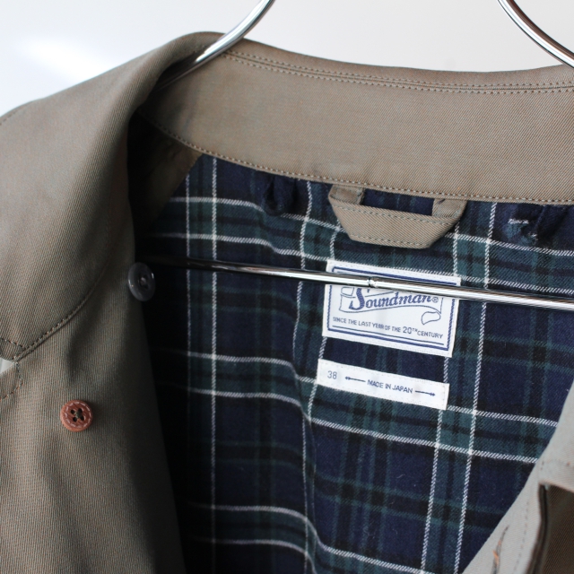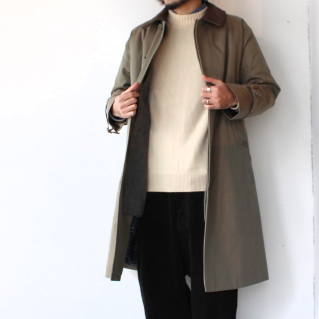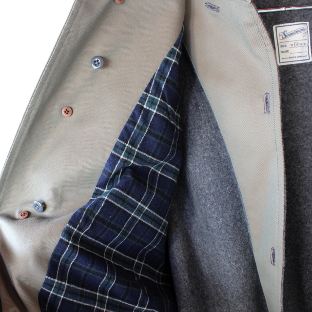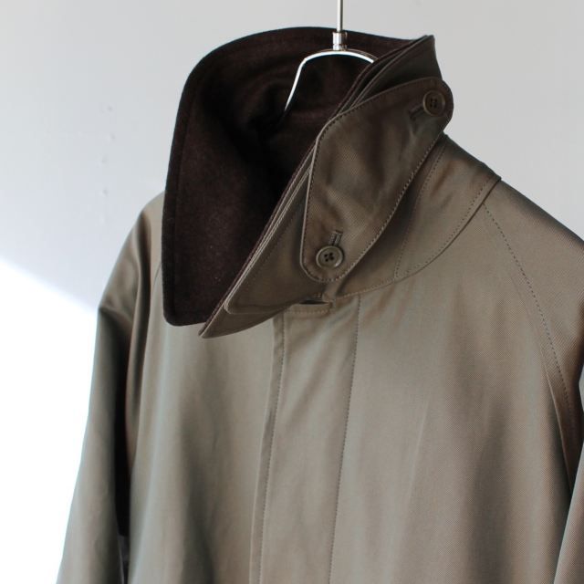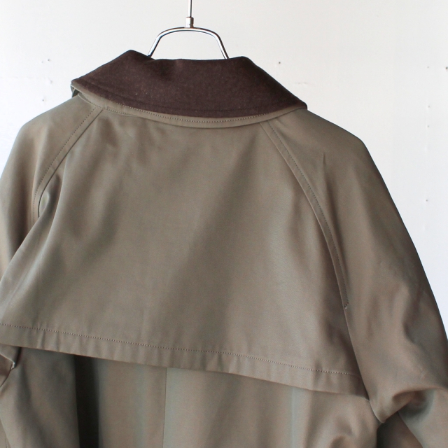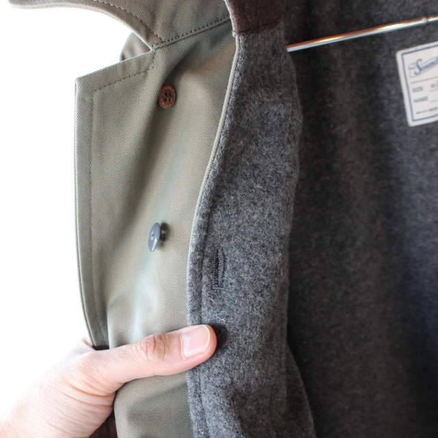 表地には撥水性の高いタマムシのヘビーなコットンギャバジンを使用し、衿にはウールフランネル、身頃にウールメルトン、袖に中綿キルティングのデタッチャブルライナーを組み合わせた3シーズン対応可能な万能型コート。