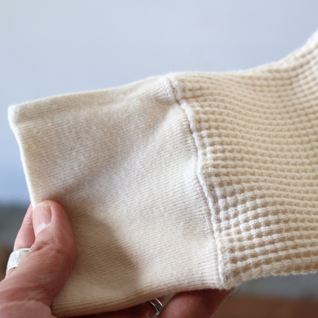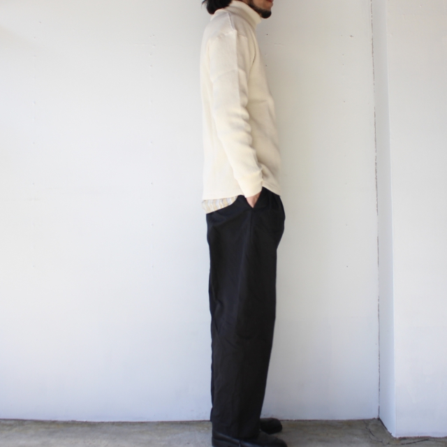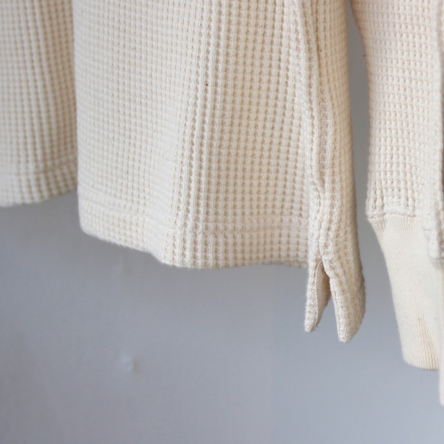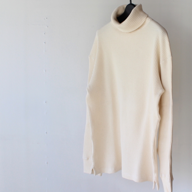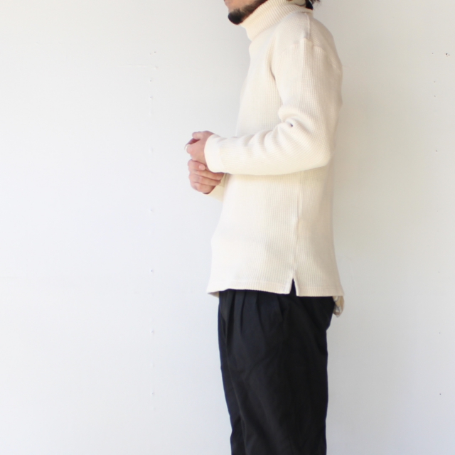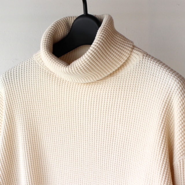 20番の太番糸で編み立てたコットンへビーワッフル生地にアレンジしたタートルネックカットソー。