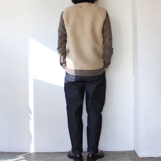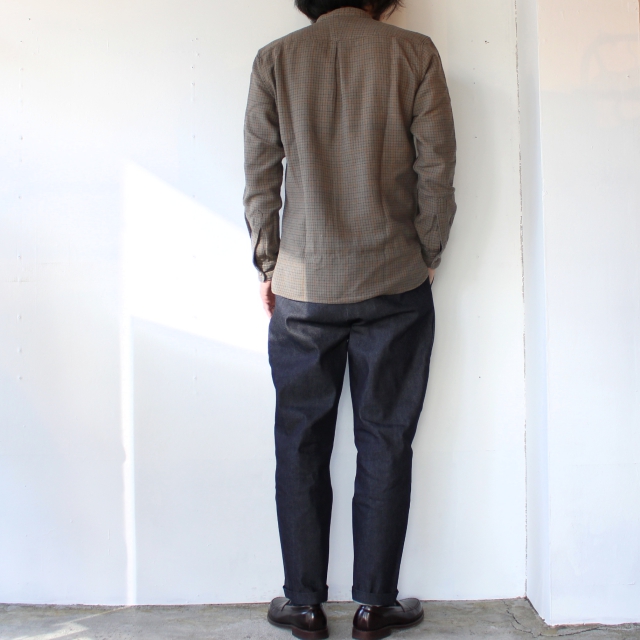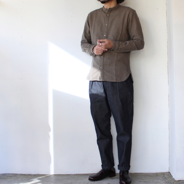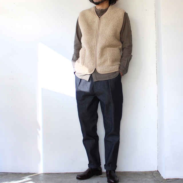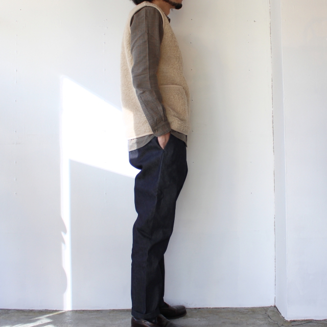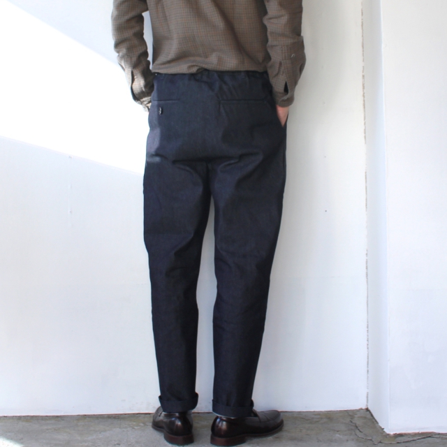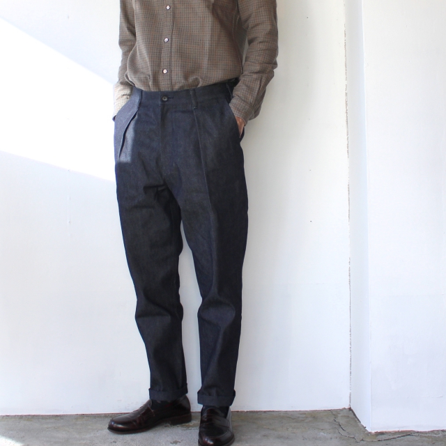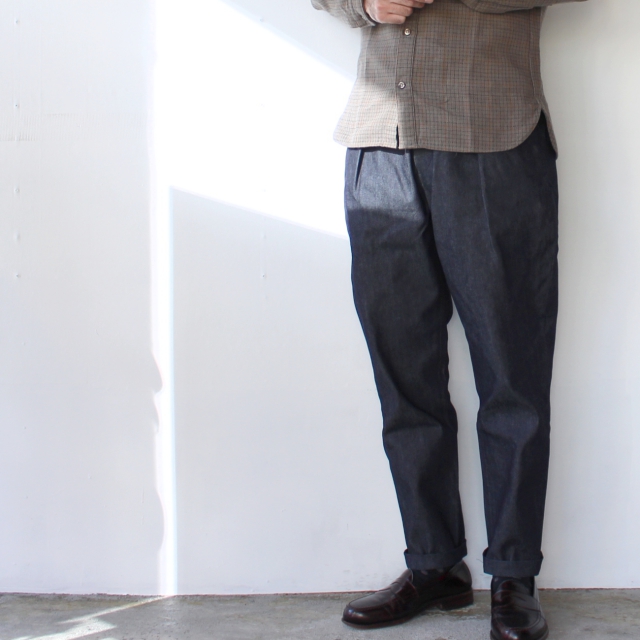 デニムパンツですが、インタック&スラントポケットの仕様でカジュアルなジーンズとは違う印象に。