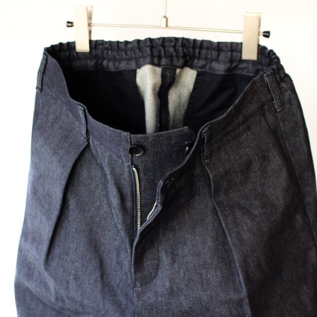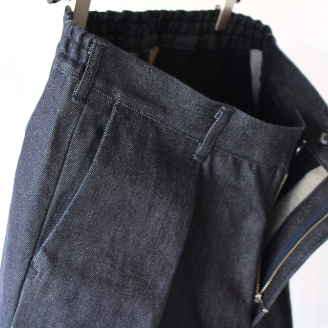 丁寧に織られた国産デニムとスラックスのディテールをかけ合わせた一本です。