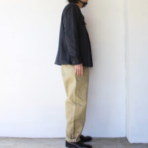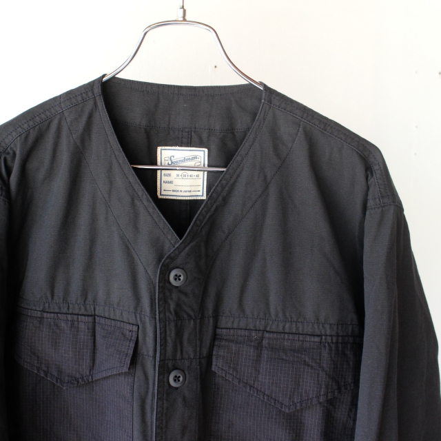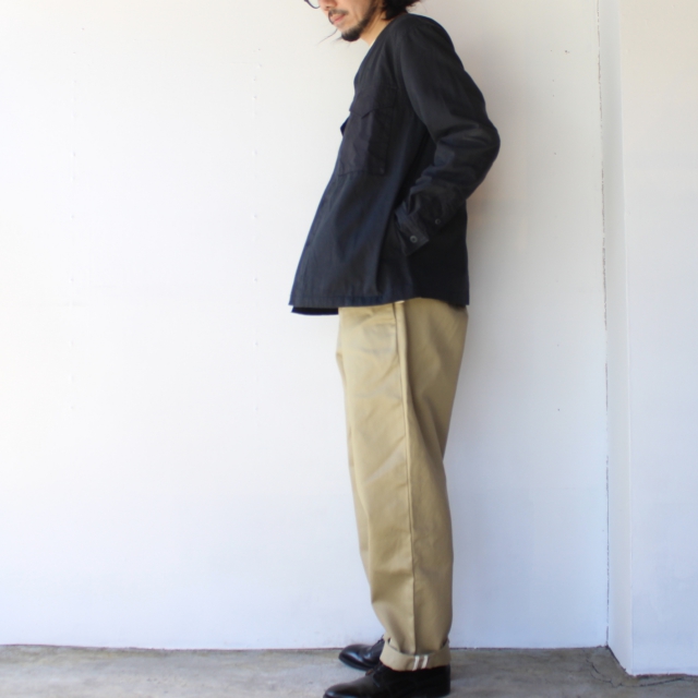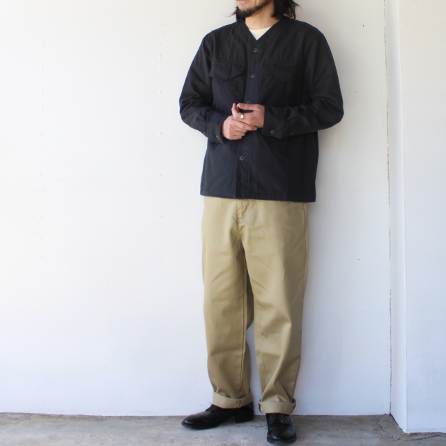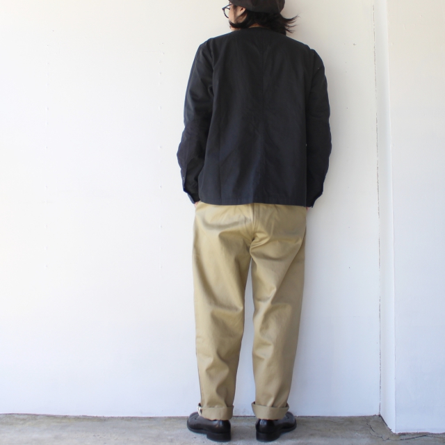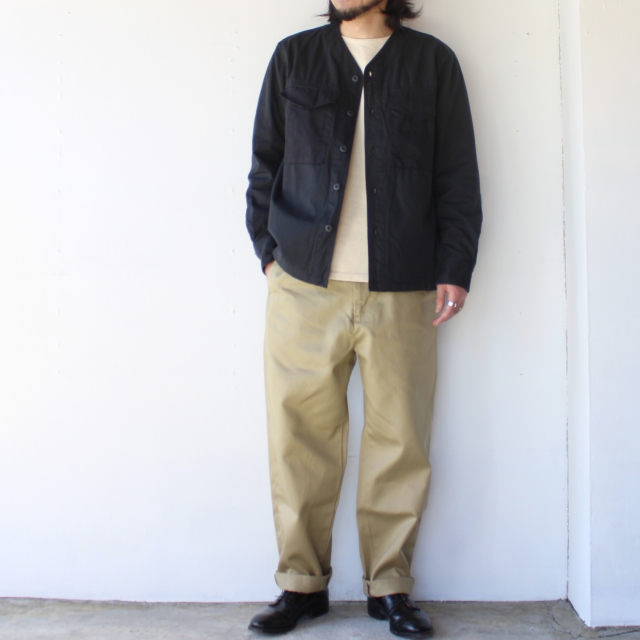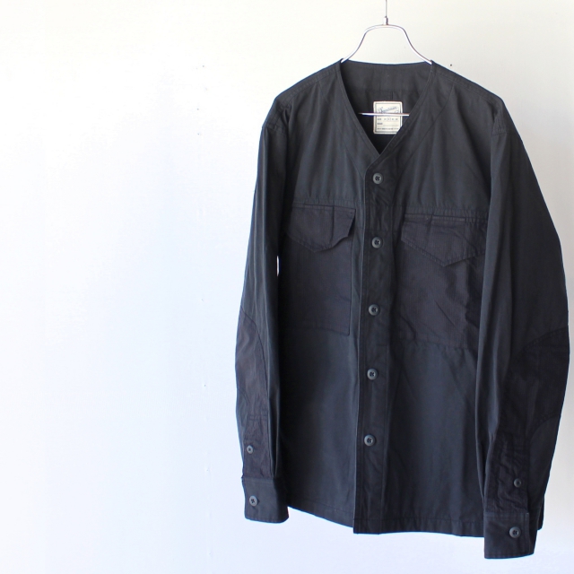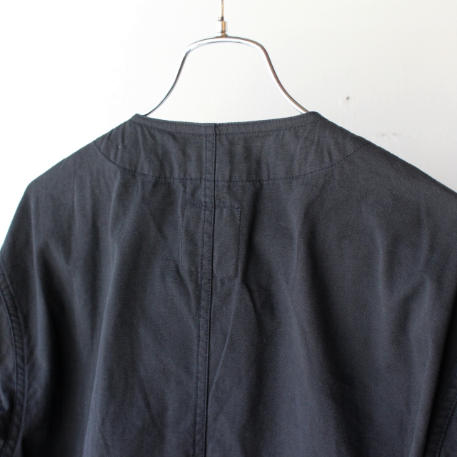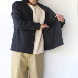 CPOジャケットをベースにした襟無しデザインの羽織り。