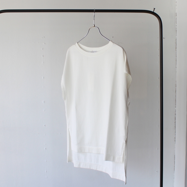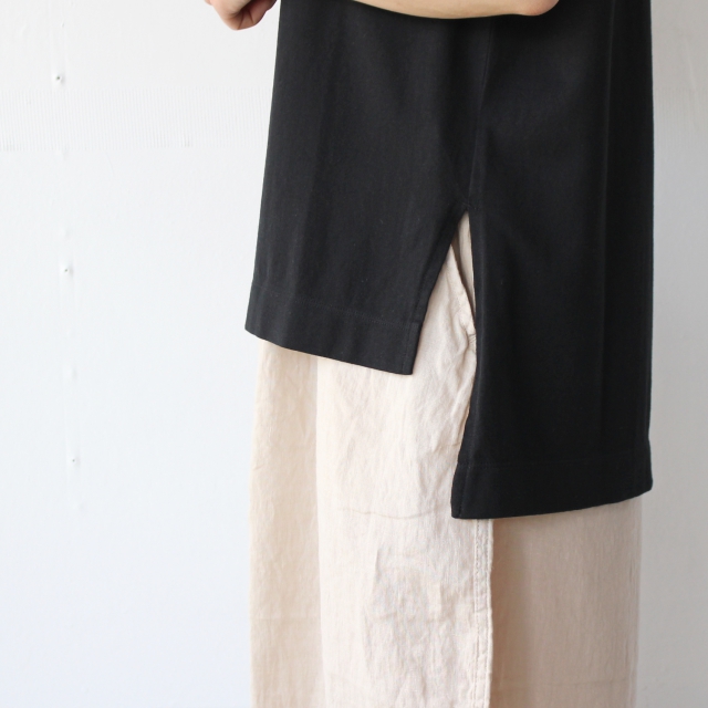 首元はわずかに横に広くとったネックに、裾は前後の着丈に変化を出してアクセントを。