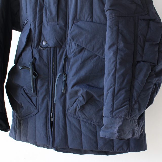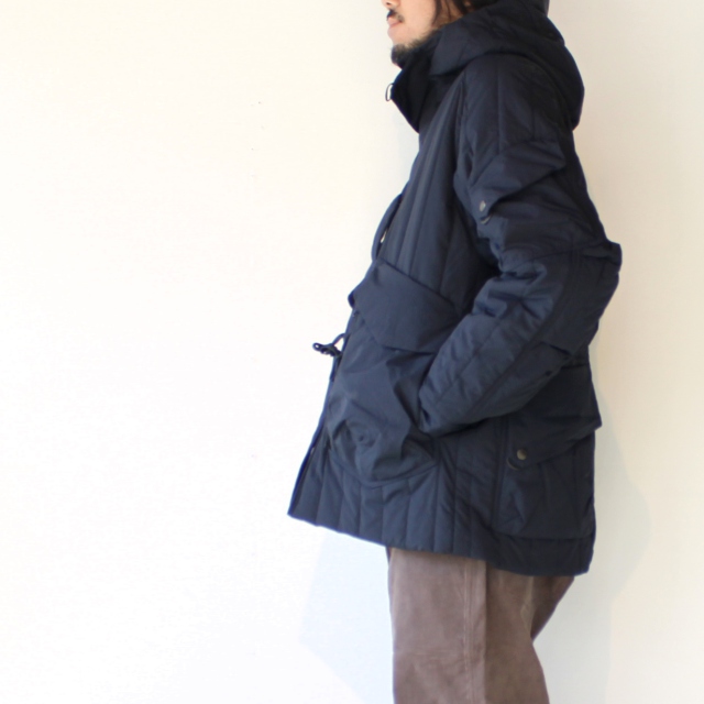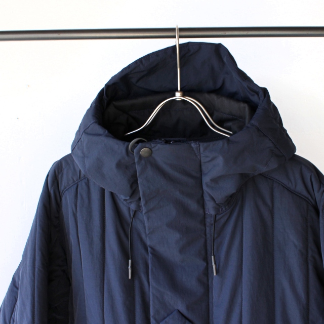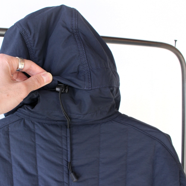 機能中綿をキルティングした生地に、さらにナノ撥水加工を施したフードジャケット。
