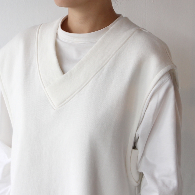 首元はVネックリブ仕様、袖なしで肩に被るバランス。