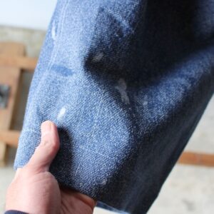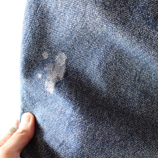 素材は、ダメージデニムを直接の加工では無く、ジャガード織りで、生地を織り上げる際にそのように表現しています。