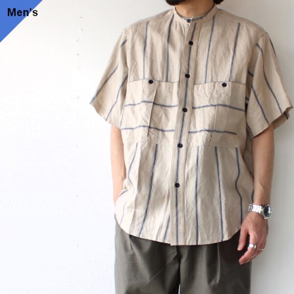 ■ 高密度リネンストライプバンドカラーシャツ 822326