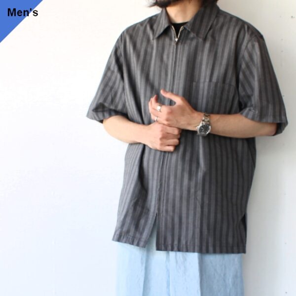 THE HINOKI 半袖ジップシャツ OG Cotton Poplin Stripe Half Sleeve Zip Shirt / TH23S-28 (Charcoal Stripe)