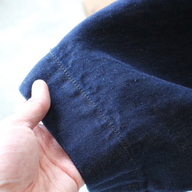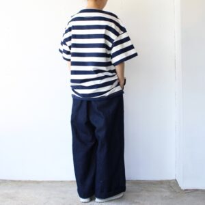 10ozの緯糸リネンデニムを使用したストンと落ちるワイドストレートシルエットジーンズ。