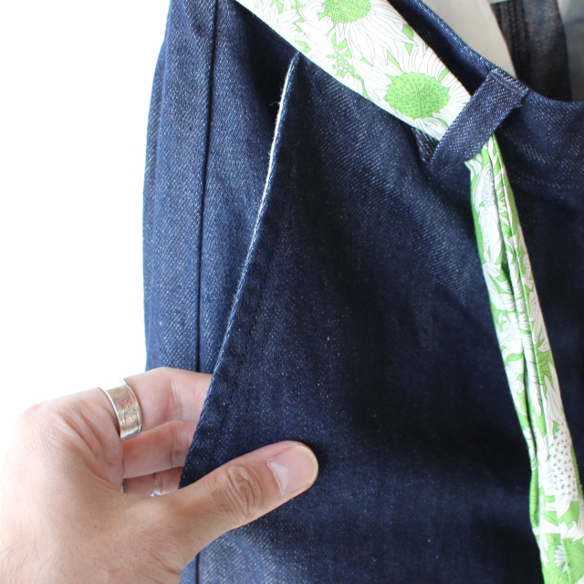 デニムの濃紺とリバティスカーフの鮮やかなマスカット色のコントラストがGOOD◎