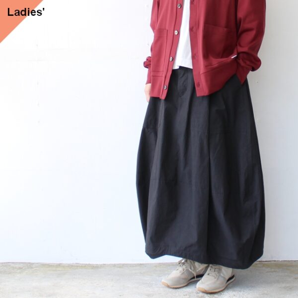 USユーティリティパンツのディテールを取り入れたバルーンシルエットのロングスカート。ウエストはゴムシャーリング仕様で腰裏にはスピンドルで調整出来る様仕上げています。